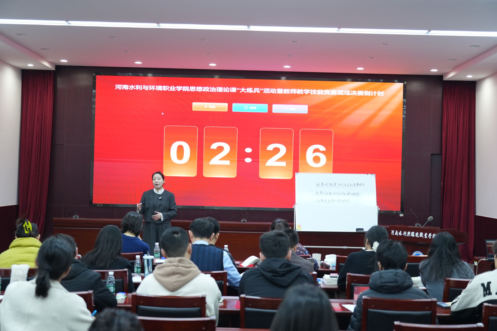 竞赛依据我省教育厅开展的全省学校思想政治理论课教学技能“大练兵 大比武 大展示”活动要求,设置材料初审和现场决赛两大环节,构建了“筛选--竞技--点评--提升”的完整闭环。本次竞赛共有30位老师报名参加,通过初审环节专家评委从教学内容编排、教学方法创新、教学效果达成等维度,对参赛教师提交的学情分析、创新教案、说课视频等核心材料进行了细致审阅与量化评分,最终评选出14位选手晋级现场决赛。