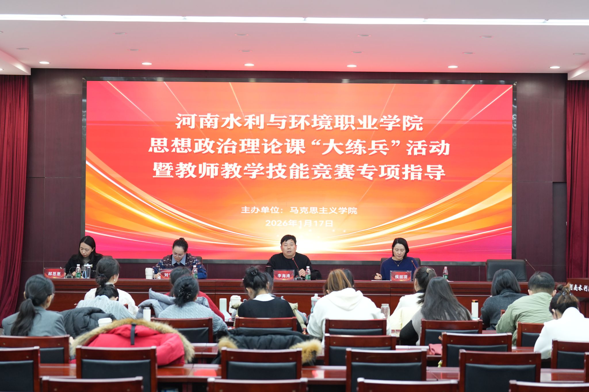 为持续深化思想政治理论课改革创新,着力锻造高素质思政课教师队伍,全面提升思政课教学质量,1月17日,马克思主义学院在花园路图书馆报告厅成功举办2026年度思想政治理论课“大练兵”活动暨教师技能竞赛现场决赛。竞赛特邀河南工业大学马克思主义学院院长李海涛,郑州航空工业管理学院马克思主义学院副院长侯丽羽、河南农业大学马克思主义学院教师刘宁静担任专家评委,并创新设置同行评委和学生评委共同参与现场决赛的评审。